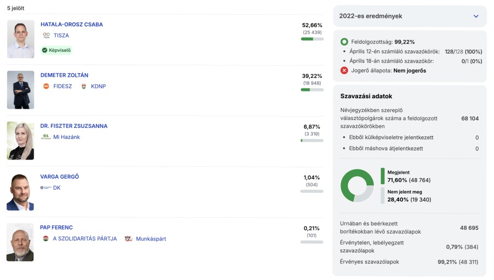 Hatala-Orosz Csaba, a Tisza Párt jelöltje a szavazatok 52,66%-át szerezte meg, 99,22%-os feldolgozottság mellett. A térség korábbi országgyűlési képviselője, Demeter Zoltán (FIDESZ-KDNP) 39,22%-ot, dr. Fiszter Zsuzsanna (Mi Hazánk) 6,87%-os, Varga Gergő (DK) 1,04%-ot, Pap Ferenc (A Szolidaritás Pártja) 0,21%-ot ért el.